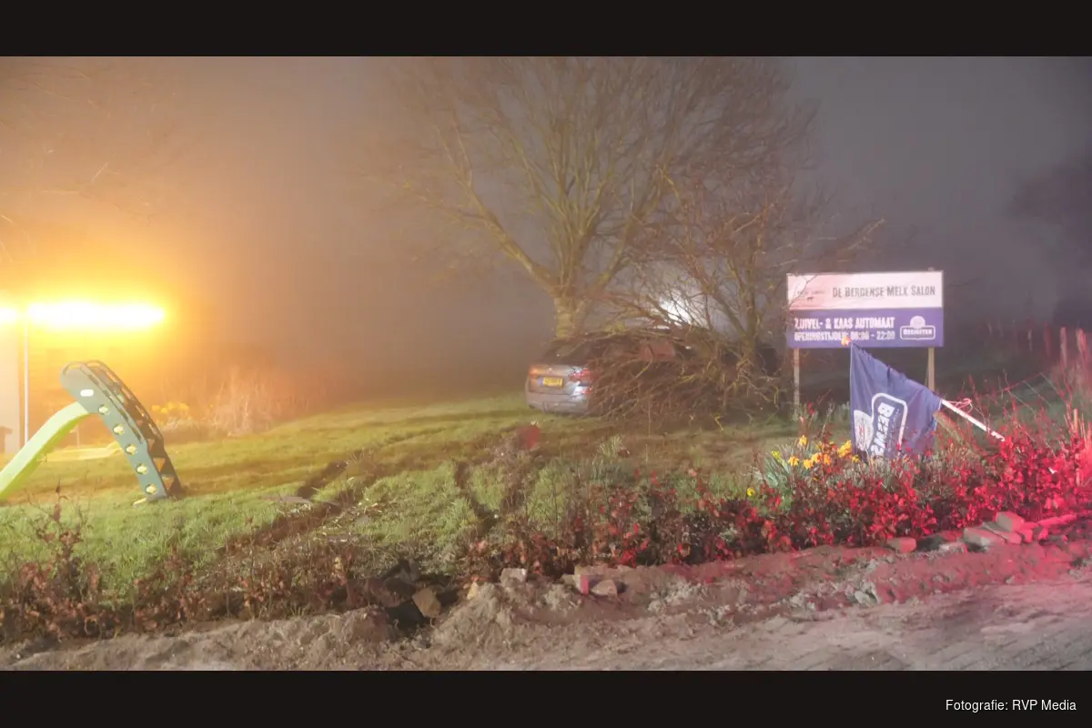 Een automobilist reed vanaf Bergen richting de N9 toen de bestuurder in een bocht de macht over het stuur verloor en door een hekwerk reed waarna de bestuurder een boom uit de grond reed en in de tuin tot stilstand kwam.
